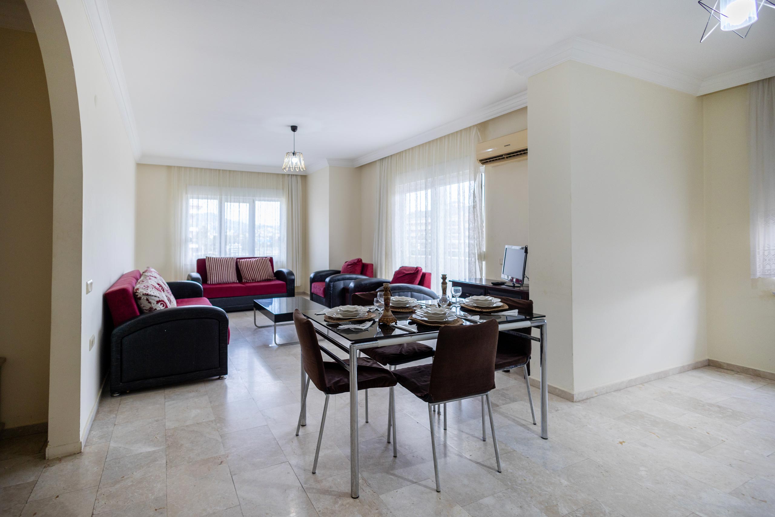 Large balcony, fully equipped kitchen and air-conditioned rooms.
